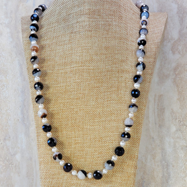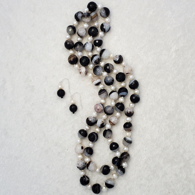 Attractive Agate Crystal & Freshwater Pearl Beaded Boho Necklace. This long single strand necklace is designed with Agate crystals and ivory freshwater pearls. Ideal combination of black, white and grey. Agate crystals are known to have properties that will rebalance and harmonize body, mind and spirit. This necklace is right on trend & so versatile, it can be worn long, doubled or with other necklaces. Necklace length 40″ long.
