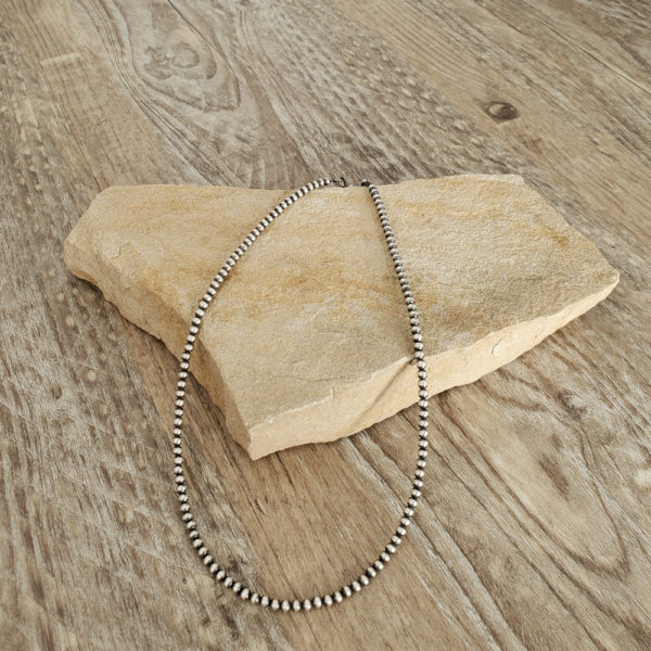 This necklace is designed with a strand of Native American Indian handcrafted sterling silver beads. The beautiful style of jewelry called Desert or Navajo Pearls are sterling silver beads traditionally made by Navajo (Diné) silversmiths. Traditionally, Navajo Pearls are individually made by hand, making each bead one of a kind. This design has one (1) strand of 4mm sterling silver beads & sterling silver lobster clasp. Wear alone or put a pendant on necklace or layer with other necklaces for an on trend look.